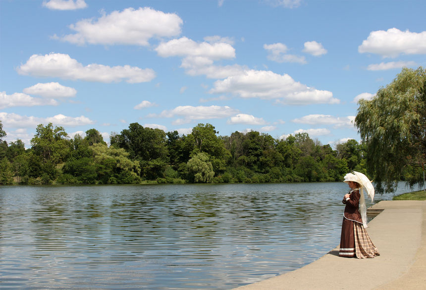 The second outfit would be a high-necked navy day dress with lace accents. This outfit would be worn by Dolly while meeting with Irene and Minnie at Irene's hat shop and confiding in a friend later in the day. Navy was selected to match the maturity of the character, nothing too bold or too juvenile. The floral fabric was selected to pair with the femininity of the scenery and Irene and Minnie.